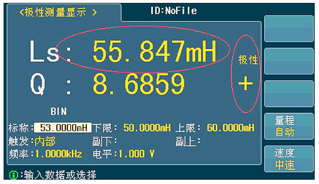 在極性測量界面,可設定:標稱值,Ls下限值,Ls上限值,Q下限值,Q上限值,